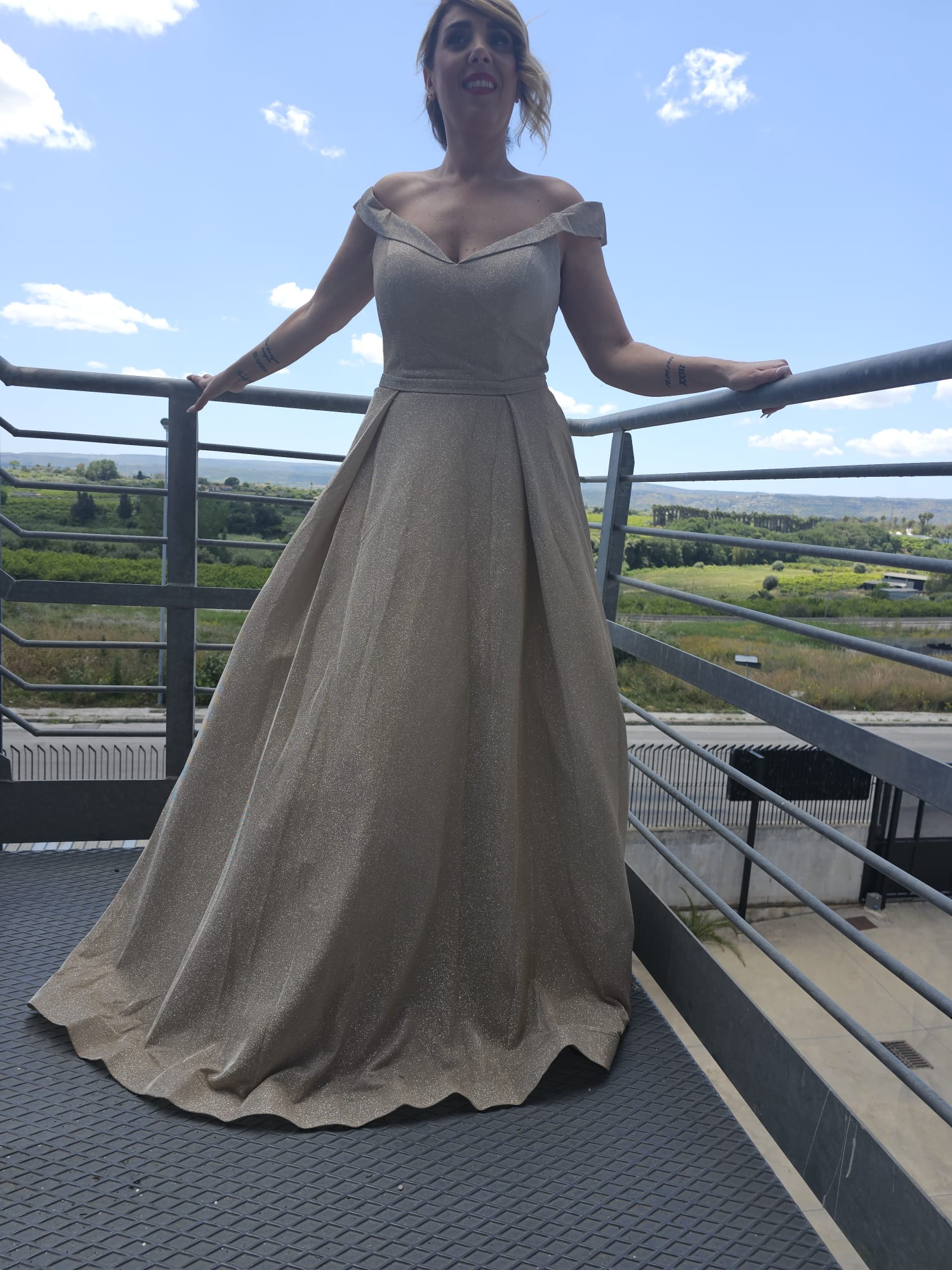 abito glitterato , scollatura a barca , abito molto vaporoso sfalsato davanti con coda ,con tasche , con lampo alla schiena abito per un giorno da immortalare